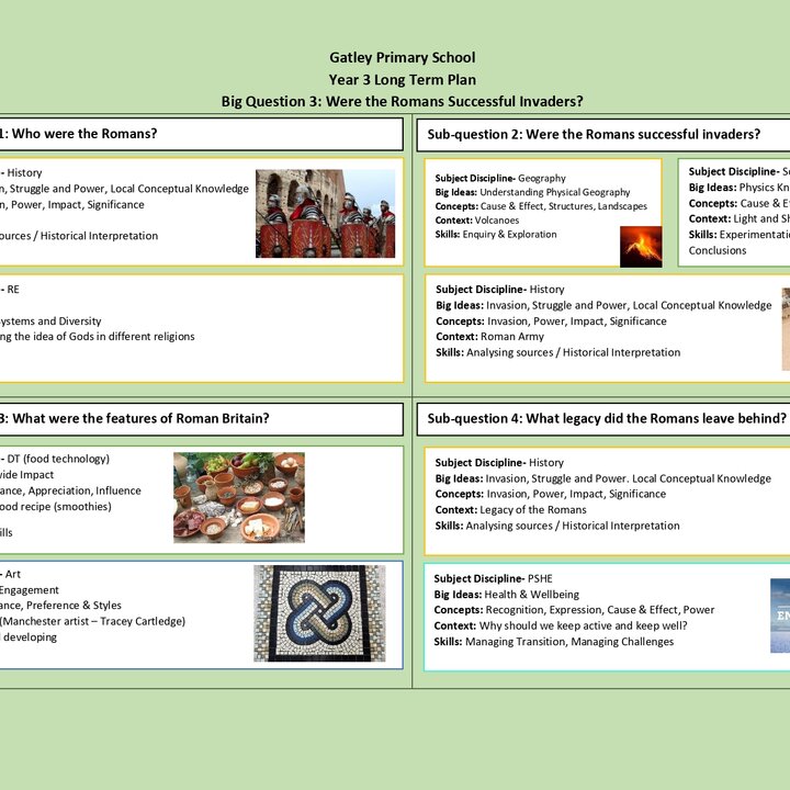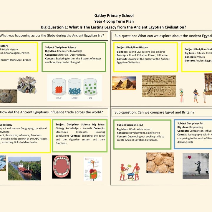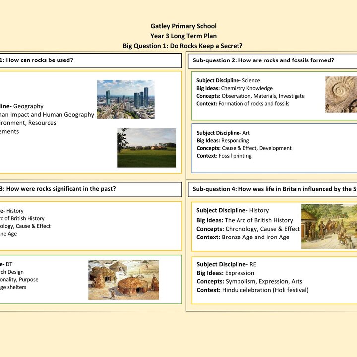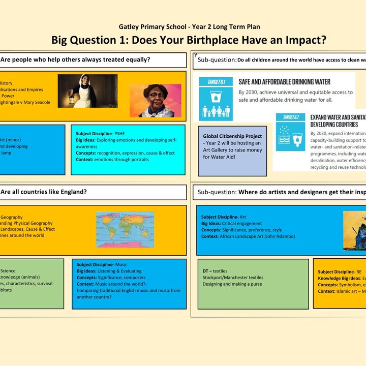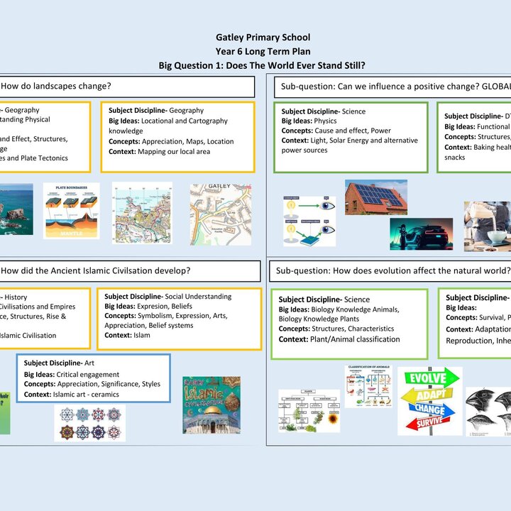 Mapping of the big ideas, and corresponding concepts, to be taught supports our pupils in seeing further connectivity within their knowledge and skills to result in a growing body of knowledge over time. Enrichment opportunities are also planned for, with each term's study cumulating in a trip or visit, a social responsibility project or a production. Additionally, each term, a class text is carefully selected, which will be shared with the children and incorporated within lesson delivery. Across the year, these texts are selected to ensure a broad and balanced reading diet and to expose our children to a wide range of genres and authors. Non-fiction texts are also carefully selected to support the delivery of each sub-question. These texts are selected to ensure our pupils are exposed to a wide range of text types and text structures.